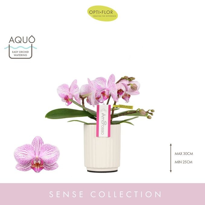 Openen in Floriday Marketingconcept Amorosso Verzorging: Standplaats pas op met volle zon Verzorging: Temperatuur max 25 °C min 15 °C Potmateriaal kweekpot kunststof Potmaat 7 cm Min planthoogte inclusief pot 25 cm Rijpheidsstadium 1-2 Min aantal bloemen/bloeiwijzen pot 15 Minimum aantal takken per plant 3 Transporthoogte 30 cm Min aant vertakkingen pr bloeiwijze onvertakt Gewicht (gemiddeld) 400 gram Potvorm met waterreservoir Potkleur wit Potmateriaal ompot keramiek Land van herkomst Nederland Kwaliteitsgroep A1 Themadagen Valentijn Producentengroepen Opti-flor
