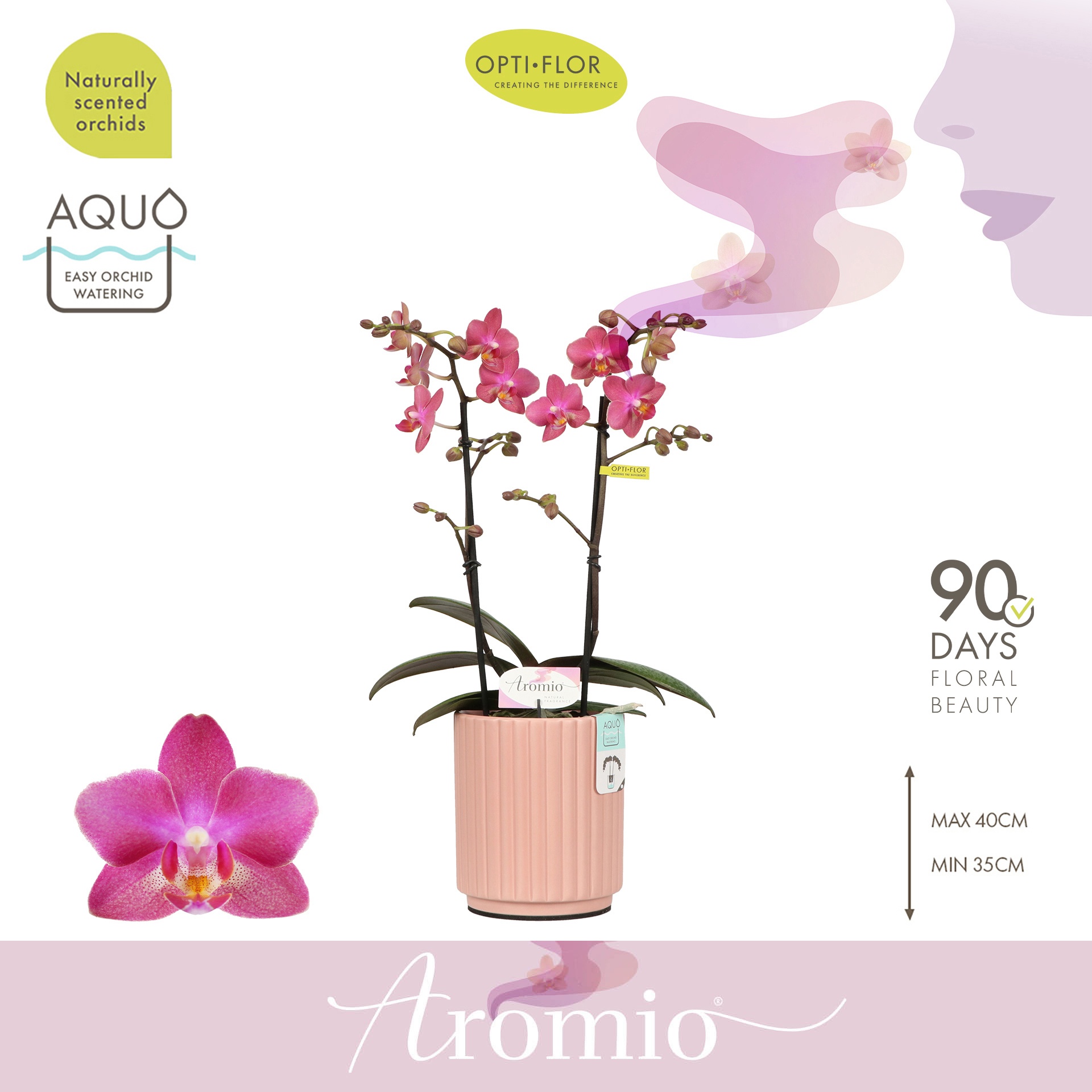 Openen in Floriday Marketingconcept Aromio Verzorging: Standplaats pas op met volle zon Verzorging: Temperatuur max 25 °C min 15 °C Potmateriaal kweekpot kunststof Potmaat 12 cm Min planthoogte inclusief pot 35 cm Rijpheidsstadium 1-2 Min aantal bloemen/bloeiwijzen pot 20 Minimum aantal takken per plant 2 Transporthoogte 55 cm Min aant vertakkingen pr bloeiwijze vertakt Gewicht (gemiddeld) 500 gram Minimum bloemdiameter 5 cm Verpakkingswijze potweb Potvorm met waterreservoir Potkleur zalm Potmateriaal ompot keramiek Land van herkomst Nederland Overige informatie planten geurend Kwaliteitsgroep A1 Themadagen Moederdag Producentengroepen Opti-flor
