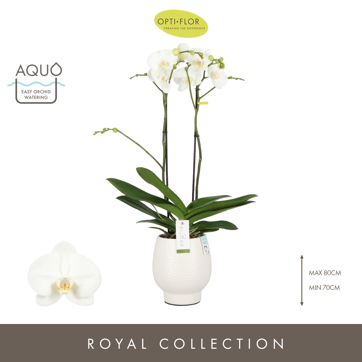 Openen in Floriday Marketingconcept Bijoux Verzorging: Standplaats pas op met volle zon Verzorging: Temperatuur max 25 °C min 15 °C Potmateriaal kweekpot kunststof Potmaat 15 cm Min planthoogte inclusief pot 70 cm Rijpheidsstadium 1-2 Min aantal bloemen/bloeiwijzen pot 14 Minimum aantal takken per plant 2 Transporthoogte 100 cm Min aant vertakkingen pr bloeiwijze onvertakt Gewicht (gemiddeld) 3000 gram Potvorm met waterreservoir Potkleur wit Potmateriaal ompot keramiek Land van herkomst Nederland Kwaliteitsgroep A1 Themadagen Moederdag Producentengroepen Opti-flor