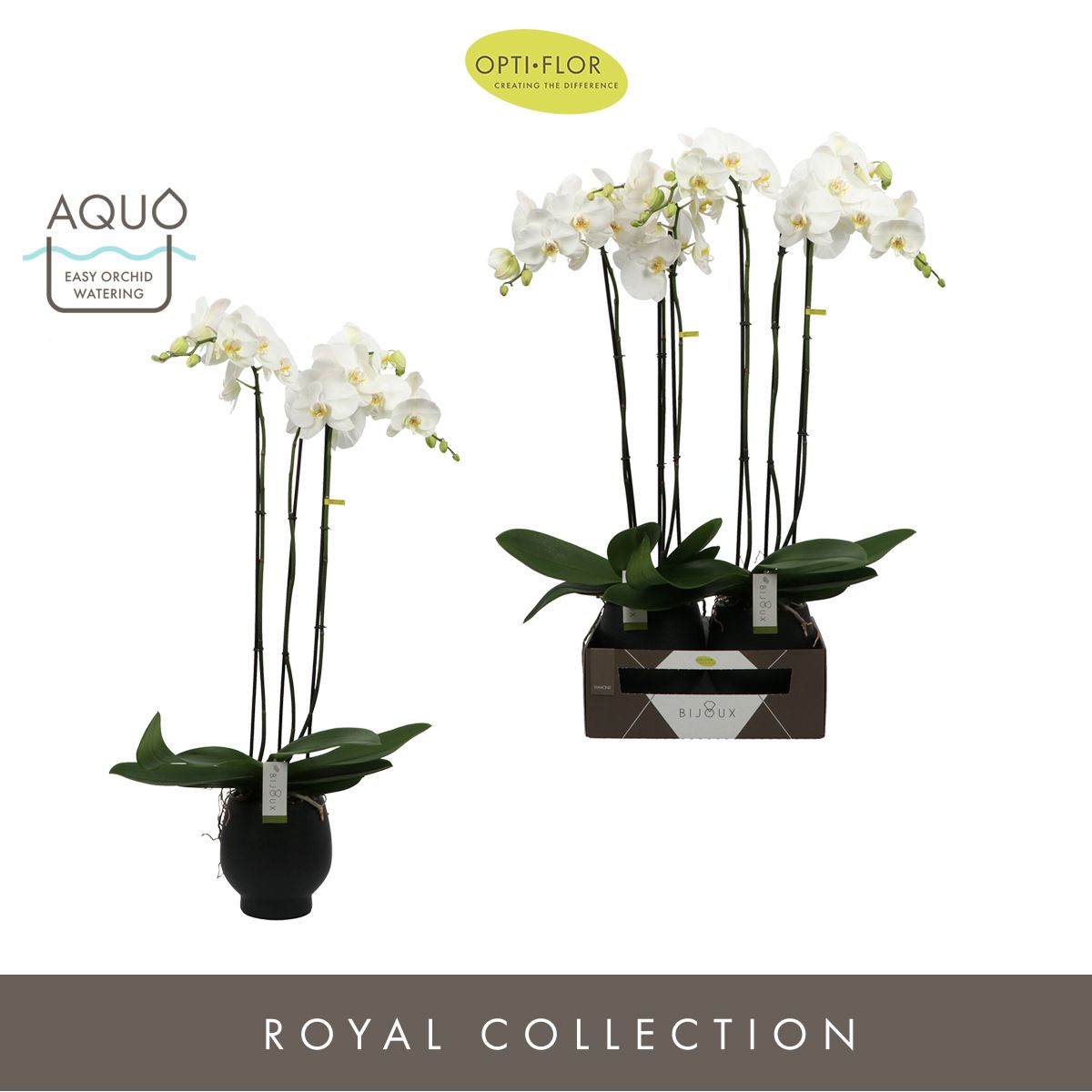 Openen in Floriday Marketingconcept Bijoux Verzorging: Standplaats pas op met volle zon Verzorging: Temperatuur max 25 °C min 15 °C Potmateriaal kweekpot kunststof Potmaat 15 cm Min planthoogte inclusief pot 100 cm Rijpheidsstadium 1-2 Min aantal bloemen/bloeiwijzen pot 24 Minimum aantal takken per plant 3 Transporthoogte 120 cm Min aant vertakkingen pr bloeiwijze onvertakt Gewicht (gemiddeld) 3000 gram Potvorm met waterreservoir Potkleur zwart Potmateriaal ompot keramiek Land van herkomst Nederland Kwaliteitsgroep A1 Producentengroepen Opti-flor
