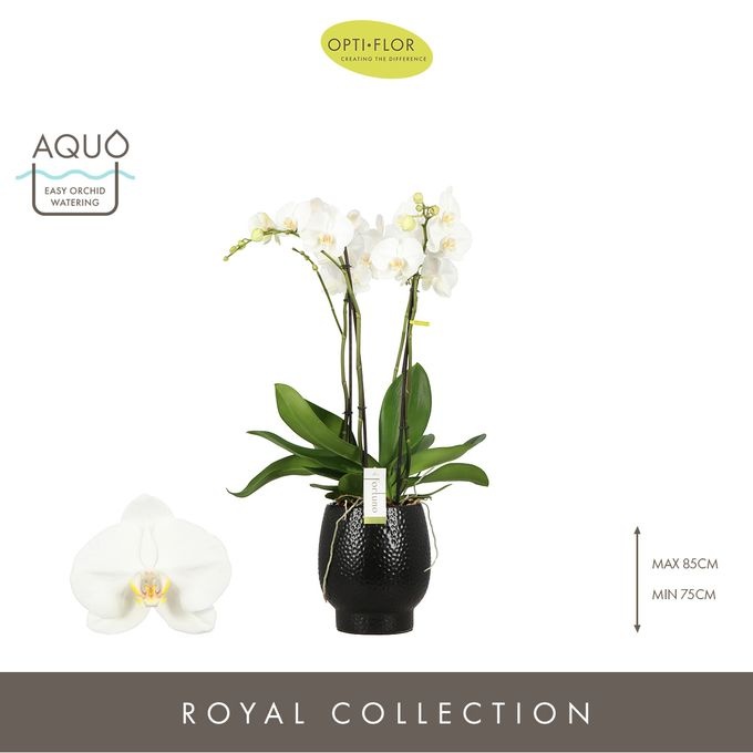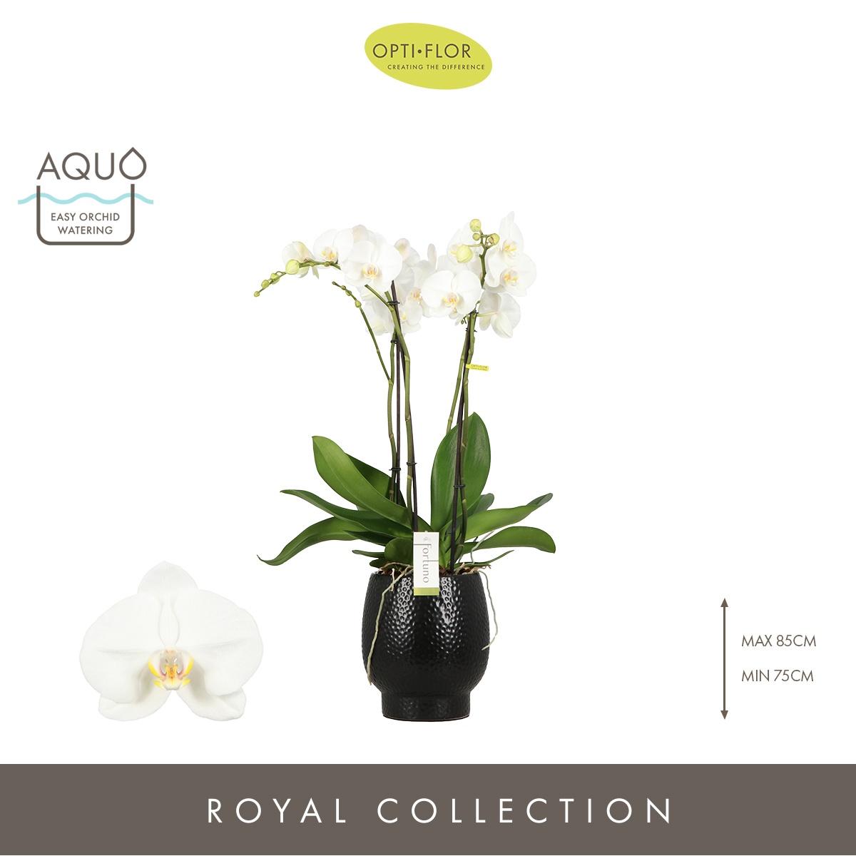 Openen in Floriday Marketingconcept Fortuno Verzorging: Standplaats pas op met volle zon Verzorging: Temperatuur max 25 °C min 15 °C Potmateriaal kweekpot kunststof Potmaat 17 cm Min planthoogte inclusief pot 75 cm Rijpheidsstadium 1-2 Min aantal bloemen/bloeiwijzen pot 24 Minimum aantal takken per plant 4 Transporthoogte 100 cm Min aant vertakkingen pr bloeiwijze onvertakt Gewicht (gemiddeld) 2000 gram Potvorm met waterreservoir Potkleur zwart Potmateriaal ompot keramiek Land van herkomst Nederland Kwaliteitsgroep A1 Producentengroepen Opti-flor